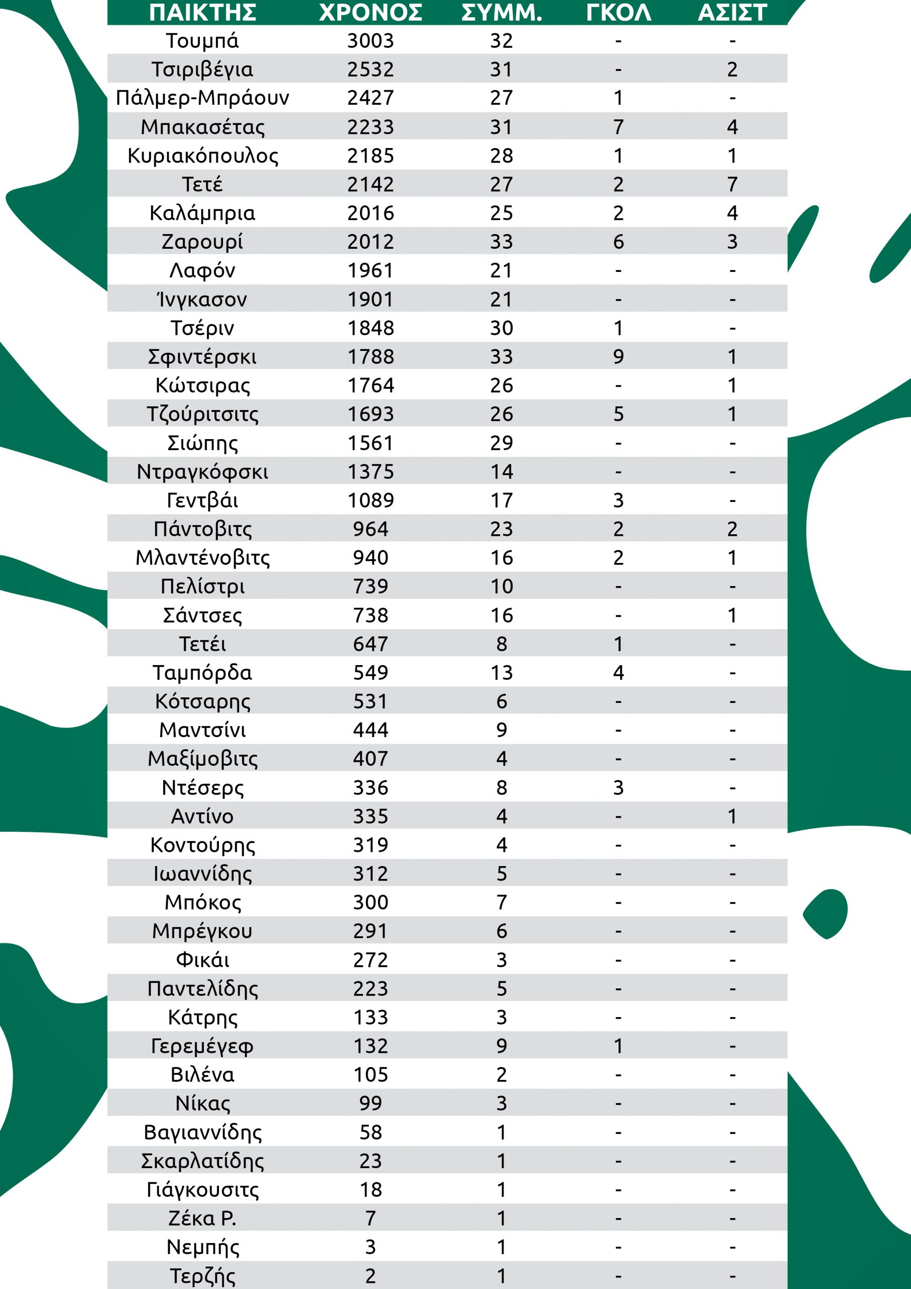 3003 λεπτά έχει αγωνιστεί ο Τουμπά, ο οποίος είναι ο παίκτης του Παναθηναϊκού με τον μεγαλύτερο χρόνο συμμετοχής στη διάρκεια της σεζόν. Έγινε ο πρώτος που ξεπέρασε τα 3000 λεπτά, έχοντας μεγάλη διαφορά απ’ τους υπόλοιπους. Ακολουθούν σε χρόνο συμμετοχής ο Τσιριβέγια με 2532′, ο Πάλμερ Μπράουν με 2427′, ο Μπακασέτας με 2233’. Τα 2000’ ξεπέρασαν και οι Κυριακόπουλος (2185’), Καλάμπρια (2016’) και Ζαρουρί (2012).