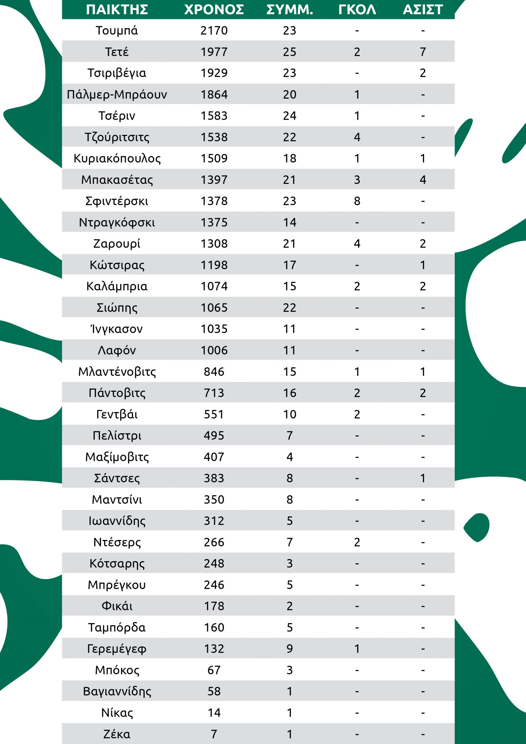 2170 λεπτά έχει αγωνιστεί ο Τουμπά, ο οποίος είναι ο παίκτης του Παναθηναϊκού με τον μεγαλύτερο χρόνο συμμετοχής στη διάρκεια της σεζόν. Ακολουθεί στη σχετική λίστα ο Τετέ με 1977 λεπτά και οι Τσιριβέγια (1929’), Πάλμερ Μπράουν (1864’), Τσέριν (1583’), Τζούριτσιτς (1538’) και Κυριακόπουλος (1509’). Είναι οι επτά «πράσινοι» με περισσότερα από 1500 αγωνιστικά λεπτά.