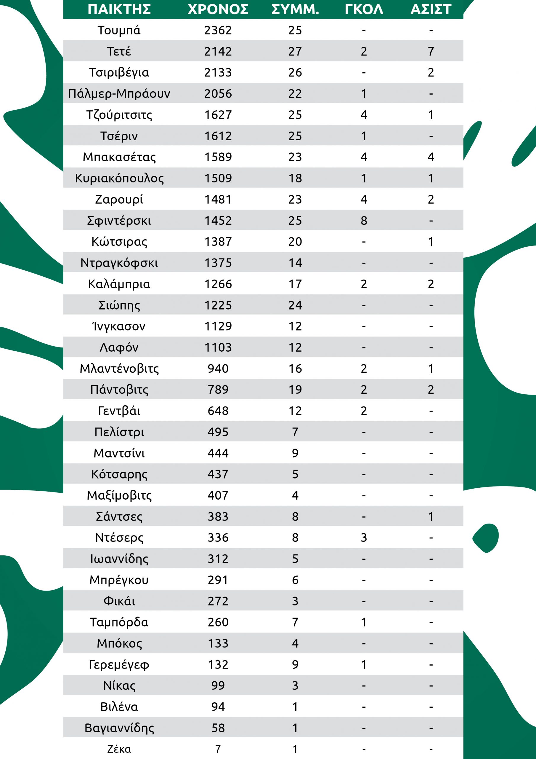 30 αγώνες έχει δώσει ο Παναθηναϊκός κατά την τρέχουσα σεζόν και ο Τετέ έπαιξε στους 27 εξ αυτών. 26 συμμετοχές έχει ο Τσιριβέγια, από 25 οι Τουμπά, Τζούριτσιτς, Τσέριν, Σφιντέρσκι και 24 ο Σιώπης.