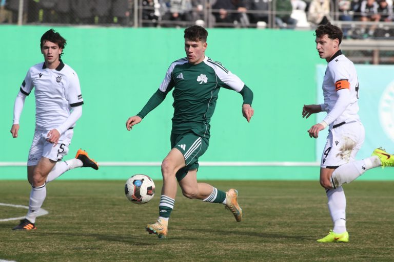 Με ρεσιτάλ επιθετικού ποδοσφαίρου η ομάδα κάτω των 19 ετών του Παναθηναϊκού νίκησε εύκολα με 3-0 τον Λεβαδειακό στο Κορωπί. Όπως έκανε και στα προηγούμενα παιχνίδια της, η ομάδα του Σωτήρη Συλαϊδόπουλου μπήκε πολύ δυνατά στο παιχνίδι και παράλληλα έχασε σωρεία ευκαιριών. Μόλις στο 7′ ο Σέχου κέρδισε πέναλτι, όμως ο Αθανασακόπουλος αστόχησε στέλνοντας τη μπάλα άουτ. Στο 19′ ο ίδιος παίκτης σούταρε έξω από την περιοχή άουτ, όπως και στο 23′ το σουτ του Παρασκευόπουλου. Στο 34ο λεπτό ο Σέχου πέρασε κάθετη πάσα στον Αθανασακόπουλο το πλασέ του οποίου έφυγε σύρριζα άουτ. Το ημίχρονο έκλεισε με τελευταία ευκαιρία του Παναθηναϊκού στο 41′ από την κεφαλιά του Αθανασακόπουλου που απόκρουσε ο τερματοφύλακας του Λεβαδειακού.