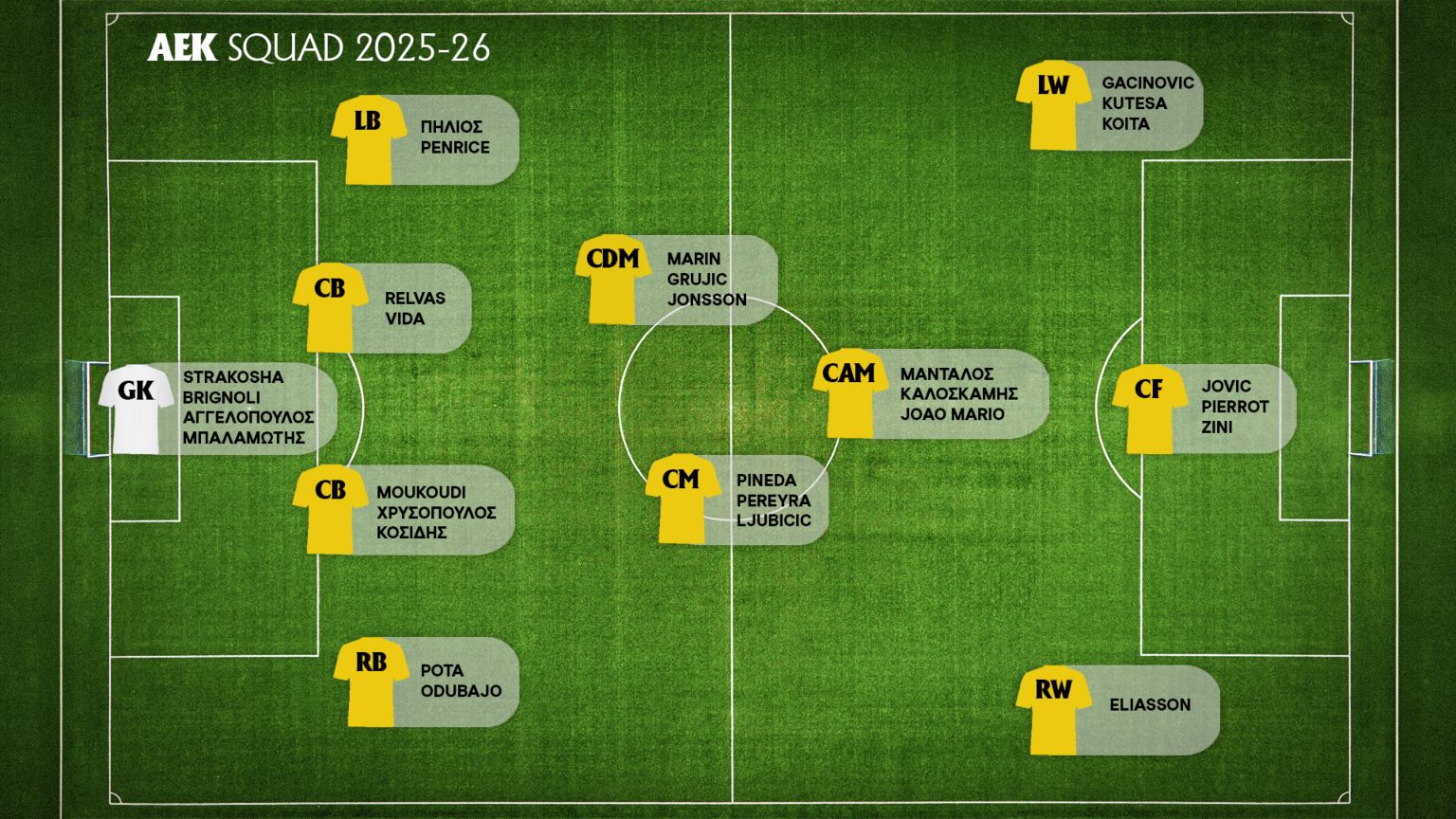 Δεν υπάρχει κάποιος παίκτης που ξεχωρίζει στο σκοράρισμα καθώς την πρώτη θέση μοιράζονται τέσσερις ποδοσφαιριστές: Κοϊτά, Πιερό, Κουτέσα και Γιόβιτς έχουν από τέσσερα γκολ σε όλες τις διοργανώσεις, ενώ από τρία έχουν οι Μάριν και Καλοσκάμης. Ο Κοϊτά είναι ο μοναδικός απ’ το ρόστερ της ομάδας που έχει αγωνιστεί και στα 24 ματς που έχει δώσει απ’ το ξεκίνημα της σεζόν! Ο Πινέδα έχει 22 παρουσίες και οι Στρακόσα, Μάριν, Μάνταλος και Πιερό από 21. Ο Μάνταλος είναι ο παίκτης με τις περισσότερες ασίστ καθώς έχει μοιράσει πέντε πάσες για γκολ. Έπονται με τέσσερις οι Ελίασον και Πήλιος.