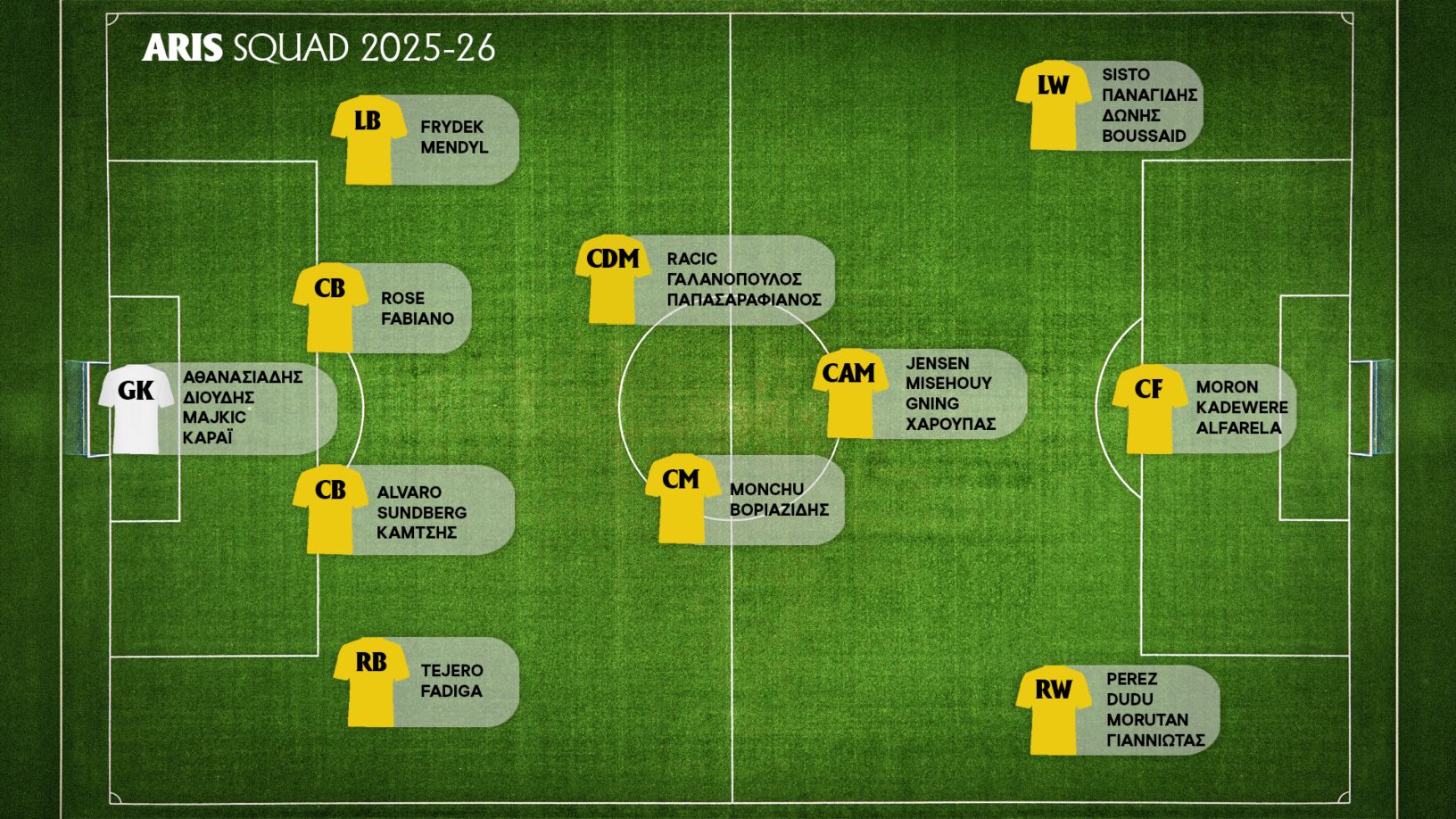 Ο Λορέν Μορόν είναι ο πρώτος σκόρερ του Άρη έχοντας πετύχει επτά γκολ σε 22 συμμετοχές στη διάρκεια της τρέχουσας σεζόν. Ακολουθεί ο Ντούντου με τρία τέρματα και οι Μόντσου, Φαμπιάνο, Μισεουί και Γένσεν, που έχουν από δύο. Ο Τεχέρο, ο Μόντσου και ο Μορόν έχουν αγωνιστεί σε 22 απ’ τα 23 ματς που έχουν δώσει οι Κίτρινοι, ενώ έπεται ο Ράτσιτς με 19 συμμετοχές. Οι τρεις πρώτοι, μαζί με τον Άλβαρο έχουν τον μεγαλύτερο χρόνο συμμετοχής μετρώντας περισσότερα από 1500 αγωνιστικά λεπτά. Ο Τεχέρο και ο Μισεουί προπορεύονται στη λίστα με τις ασίστ έχοντας από δύο.