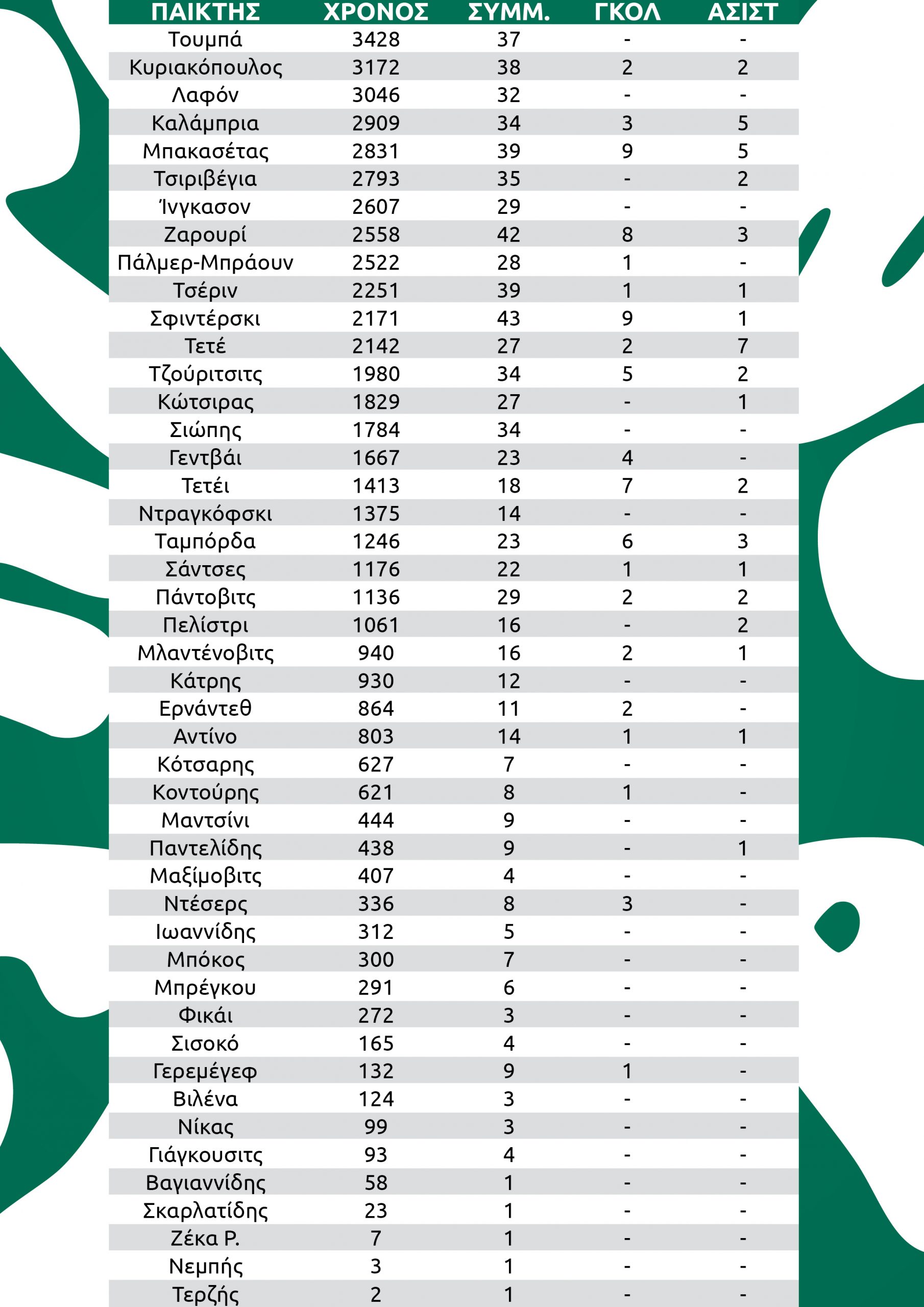 3.428 λεπτά έχει αγωνιστεί ο Τουμπά, ο οποίος είναι ο παίκτης του Παναθηναϊκού με τον μεγαλύτερο χρόνο συμμετοχής στη διάρκεια της σεζόν, έχοντας μεγάλη διαφορά απ’ τους υπόλοιπους. Ακολουθούν με 3.172’ ο Κυριακόπουλος και με 3.046’ ο Λαφόν. Αυτοί είναι οι μόνοι που έχουν ξεπεράσει τα 3.000’. Έπονται οι Καλάμπρια (2.909’), Μπακασέτας (2.831’), Τσιριβέγια (2.793’), Ίνγκασον (2.607’), Ζαρουρί (2.558’) και Πάλμερ-Μπράουν (2.522’).