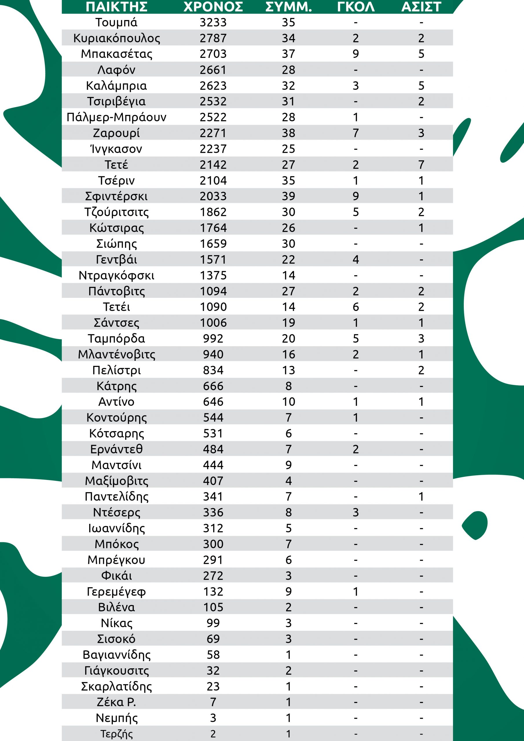 3233 λεπτά έχει αγωνιστεί ο Τουμπά, ο οποίος είναι ο παίκτης του Παναθηναϊκού με τον μεγαλύτερο χρόνο συμμετοχής στη διάρκεια της σεζόν, έχοντας μεγάλη διαφορά απ’ τους υπόλοιπους. Ακολουθεί με 2787’ ο Κυριακόπουλος, ο οποίος πέρασε στη δεύτερη θέση της σχετικής λίστας. Στην τρίτη θέση ανέβηκε ο Μπακασέτας με 2703’ και έπονται οι Λαφόν με 2661’, Καλάμπρια με 2623’, Τσιριβέγια με 2532′ και Πάλμερ Μπράουν με 2522′. Είναι οι επτά που έχουν ξεπεράσει τα 2500’.