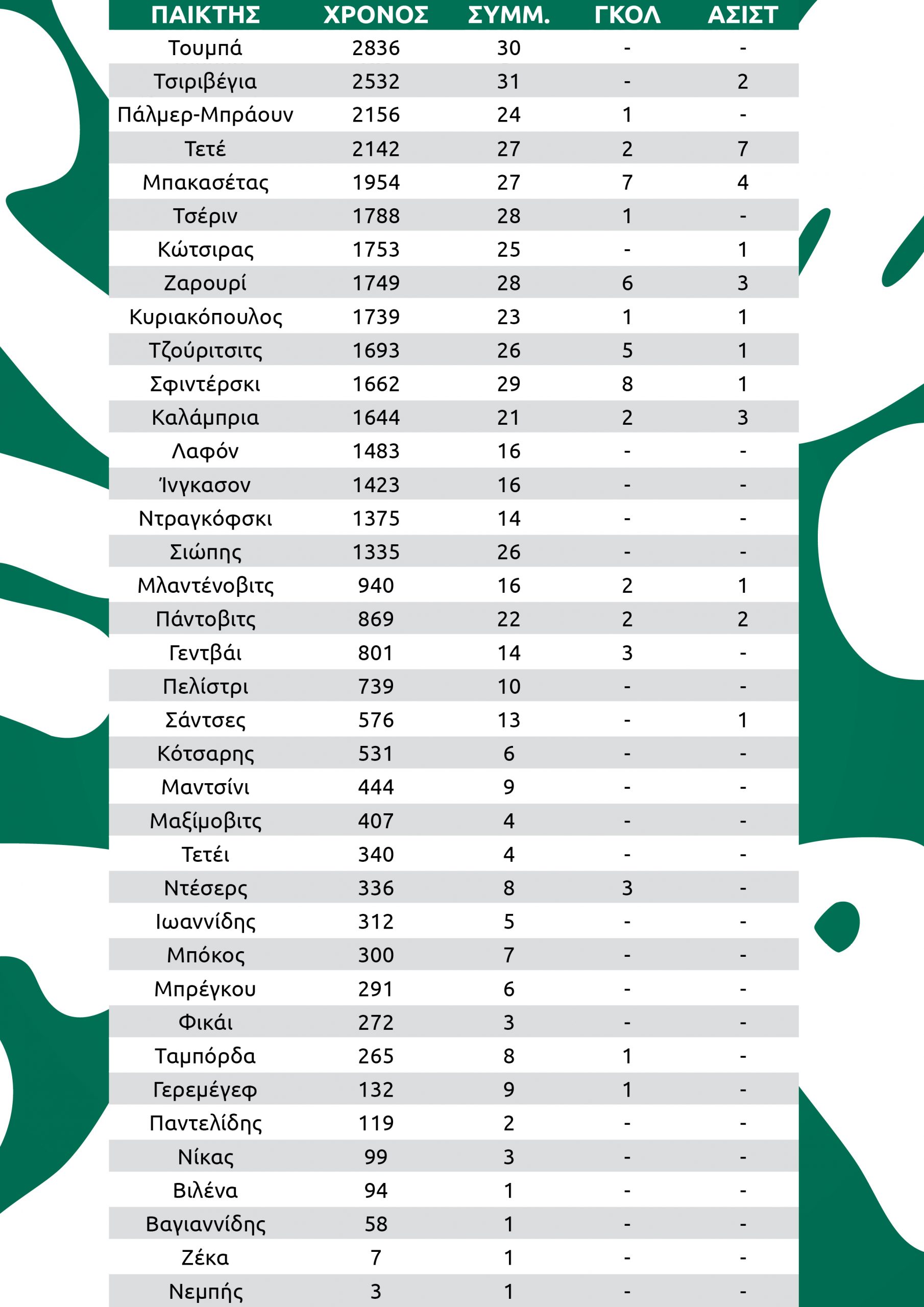 35 αγώνες έχει δώσει ο Παναθηναϊκός κατά την τρέχουσα σεζόν και ο Τσιριβέγια έχει τις περισσότερες παρουσίες. Ο Ισπανός μετράει 31 συμμετοχές, όμως το επόμενο διάστημα θα μείνει εκτός λόγω τραυματισμού. Ο Τουμπά έπεται με 30 αγώνες, ο Σφιντέρσκι με 29, ο Ζαρουρί και ο Τσέριν με 28, οι Μπακασέτας, Τετέ με 27, οι Τζούριτσιτς, Σιώπης με 26 και ο Κώτσιρας με 25.