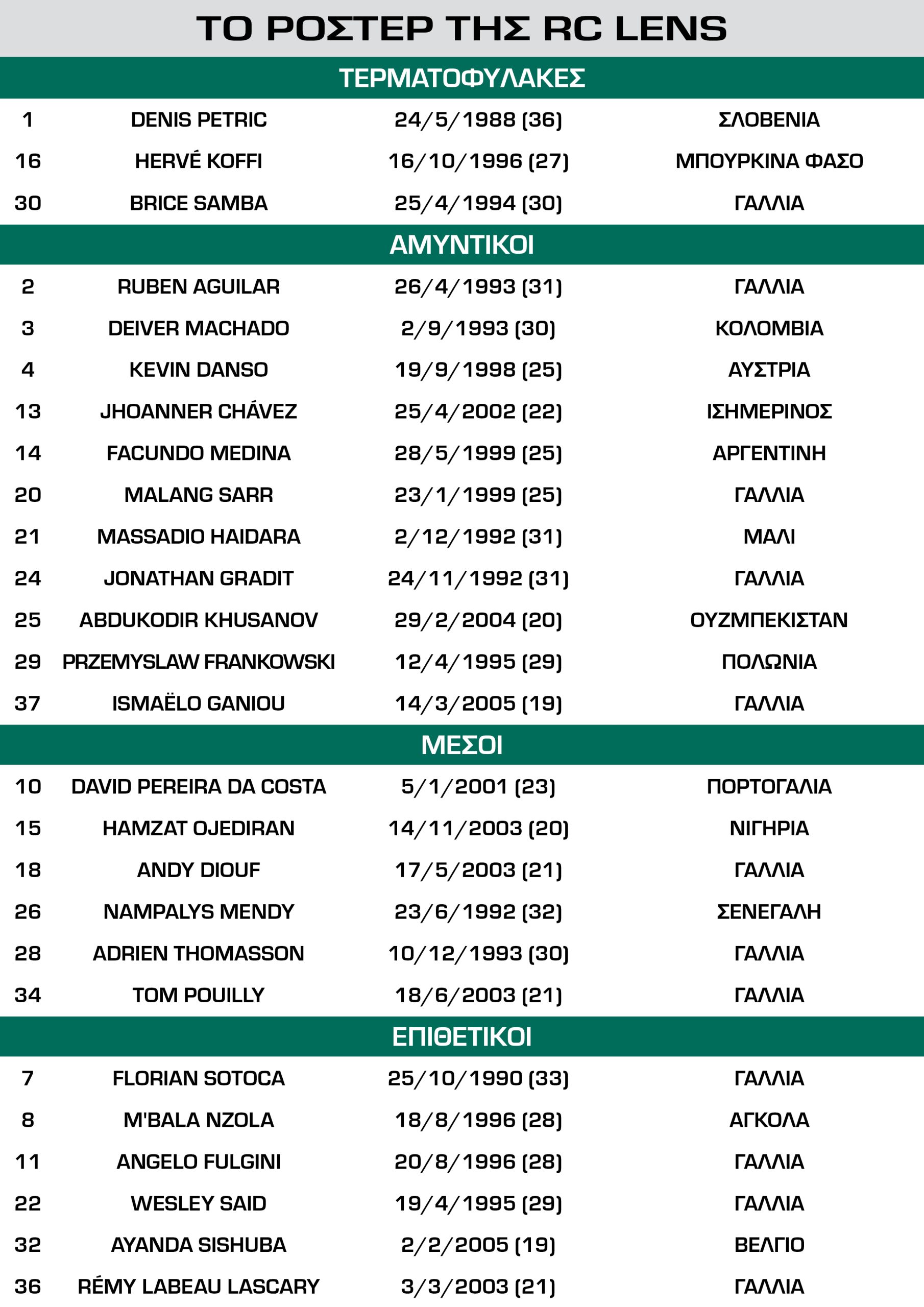 Η Λανς έχει διατηρήσει τον βασικό κορμό των τελευταίων ετών, που την περασμένη σεζόν την οδήγησε στην έβδομη θέση της Ligue 1 στέλνοντάς την στο Conference League. Κατά τη μεταγραφική περίοδο έχασε πάντως τον 21χρονο Σεπέ Ελιέ Γουαχί, ο οποίος ήταν ο πολυτιμότερος παίκτης την περασμένη σεζόν και συνεχίζει την καριέρα του στη Μαρσέιγ. Στη θέση του αποκτήθηκε με δανεισμό απ’ τη Φιορεντίνα ο Μπαλά Ενζολά, ενώ η ομάδα ενισχύθηκε, μεταξύ άλλων, με τον Μαλάνγκ Σαρ από την Τσέλσι, τον Μάρτιν Σατριάνο από την Ίντερ (με δανεισμό) και τον Ανάς Ζαρουρί απ’ την Μπέρνλι. Λίγες ώρες προτού αναχωρήσει η γαλλική ομάδα για την Ελλάδα, ολοκληρώθηκε και η συμφωνία των Λανσουά με τη Ρόμα για τον Κέβιν Ντανσό, ο οποίος αντί για την Αθήνα βρέθηκε στη Ρώμη…